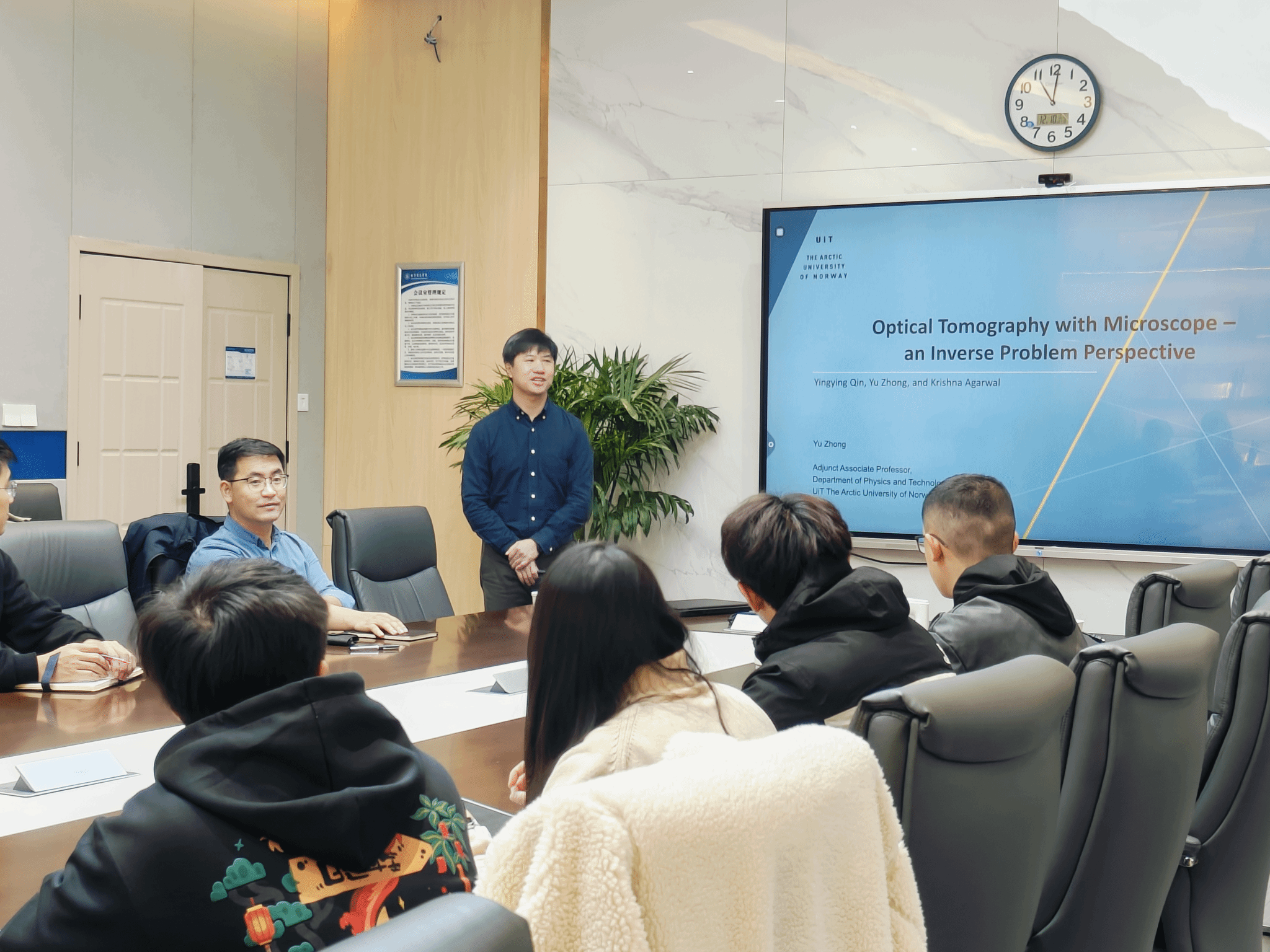 论坛伊始,李长侑副教授对钟昱副教授的到来表示了热烈欢迎,并详细介绍了其个人履历及研究方向。随后,钟昱副教授做了题为《显微镜光学成像——逆问题视角》的专题报告。钟昱副教授介绍了超分辨率光学显微镜成像中常用的方法及应用,分享了从逆问题的视角解决光员工物成像问题的相关研究进展,并结合团队长期深耕的工作,重点阐述了应用多种逆问题数值方法解决光学生物成像问题的新思路与新突破。
