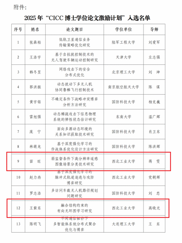 近日,中国指挥与控制学会(CICC)公布了2025年度CICC博士学位论文激励计划的评审结果,公司博士毕业生苗旺(导师:蒋雯教授)、王紫东(导师:高晓光教授)的博士学位论文成功入选。