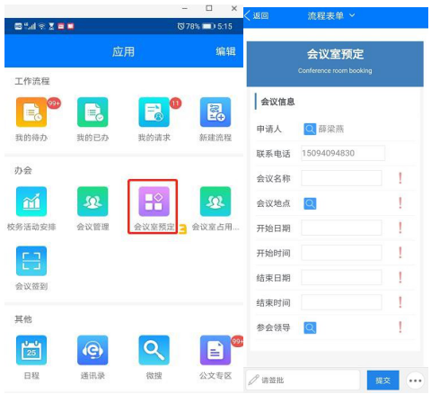 STEP2:会议室预定:在“应用”—“会议室预定”填写预定信息——点击“提交”。