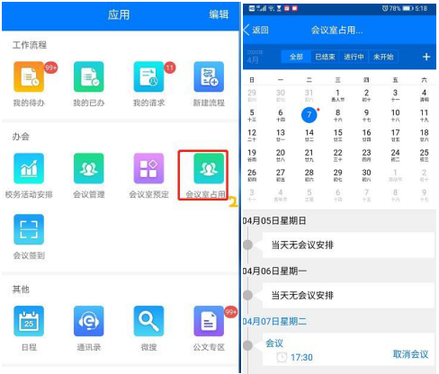 STEP1: 查看会议室使用情况:登录E-Mobile,在“应用”-“办会”-“会议室占用情况”查看。
