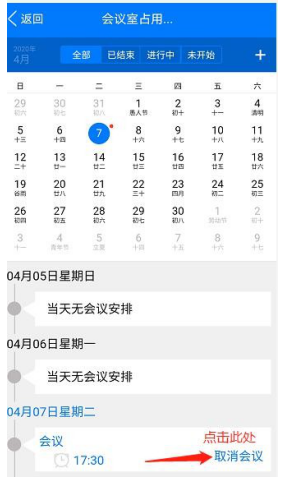 STEP3:取消会议室预定:在“会议”—“会议室占用”—点击本人预定信息右侧图标“取消会议”。