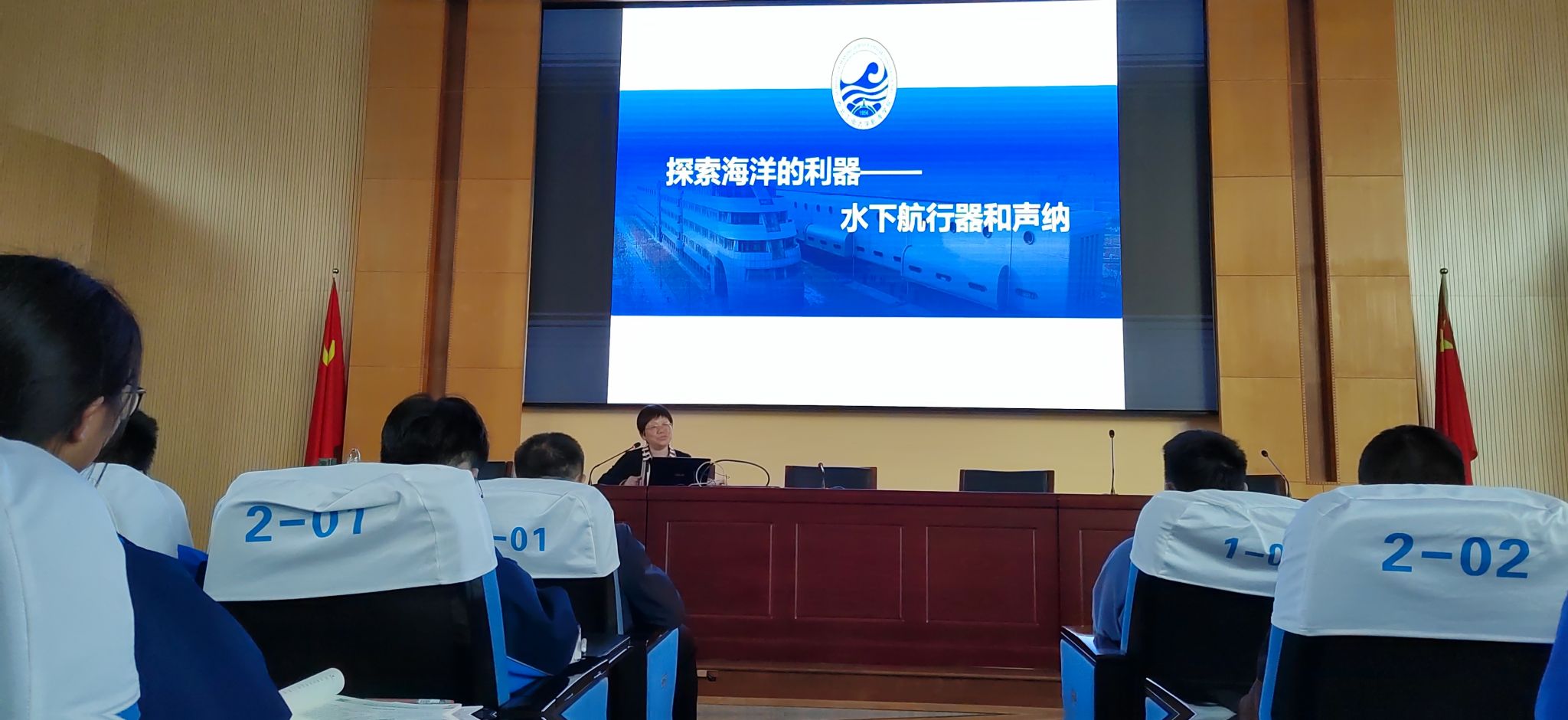 盛美萍教授在嵊州中学为高一年级同学介绍“探索海洋的利器——水下航行器和声纳”,并作了题为《从物理到数学、从交叉到融合》的科普报告,员工认真聆听,现场氛围热烈。